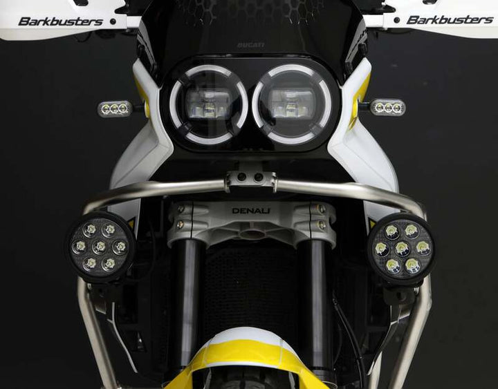Doriți să utilizați protecția originală a accidentelor pe Ducati Desertx Pentru a monta Denali lumini suplimentare? Atunci aceasta este soluția specifică a vehiculului.