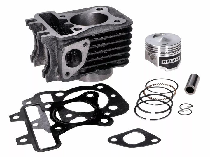 Cleanly finished Naraku 79cc Bore Cast Iron Cylinder For Scooters With 50cc Piaggio 2-Valve 4-Stroke Engine, The Compression Ratio has been specially adapted to the needs of everyday use. Thus, this cylinder kit has solid performance and torque values and at the same time is designed for durability, especialy in mountain passages or in pillion surge
