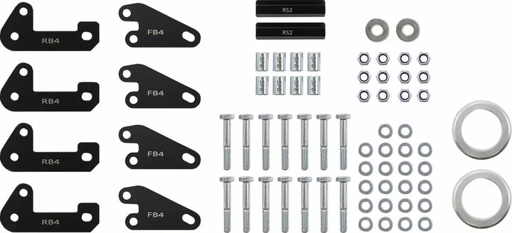 LIFTS ALL FOUR CORNERS OF THE VEHICLE FOR INCREASED BROUND CLEARANCE AND STRACHITY, DEGENINGS FOR MOUNTING LARGER TIRES, INCLUDES ALL NECESSARY HARDWARE AND INSTRUCTIONS