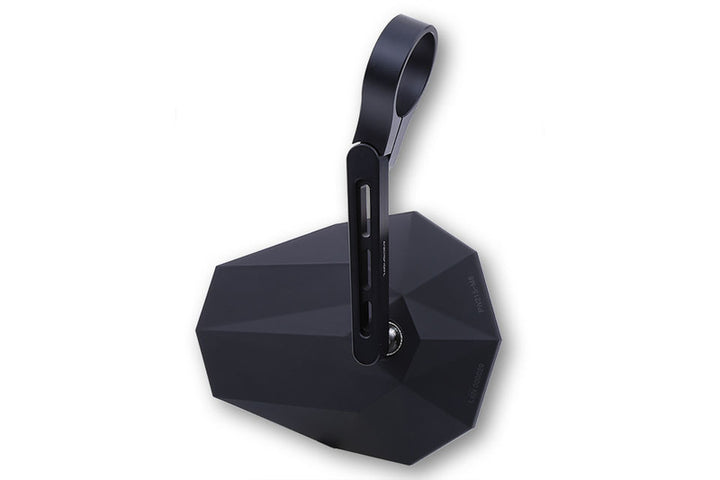 Stealth-X5 from Highsider is a compact and powerful steering end mirror with a short arm and futuristic design. It is made of black lacquered aluminum and fits both 7/8 ”(22 mm) and 1” (25.4 mm) handlebars. With its short arm it gives a sporty expression without compromising with visibility or security. The mirror is e-approved and can be mounted on both the left and right side.