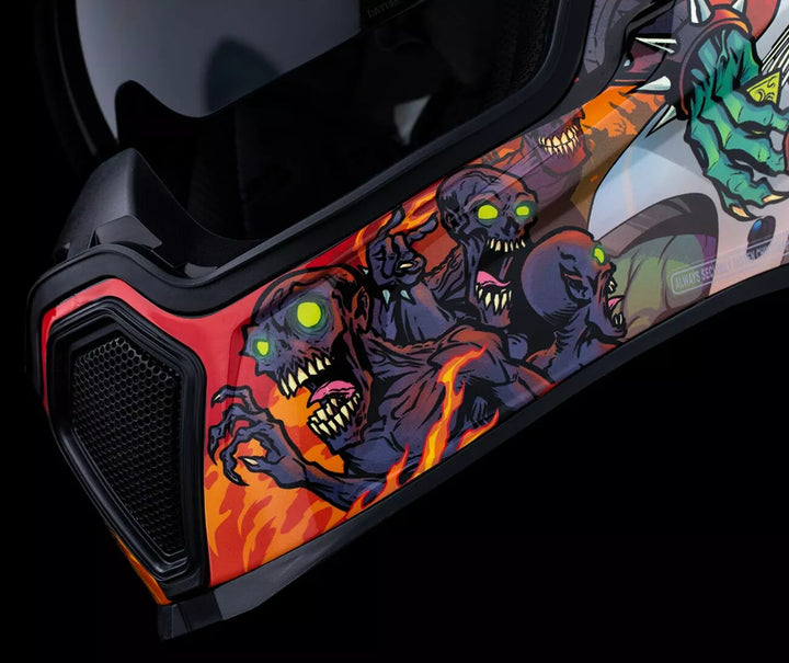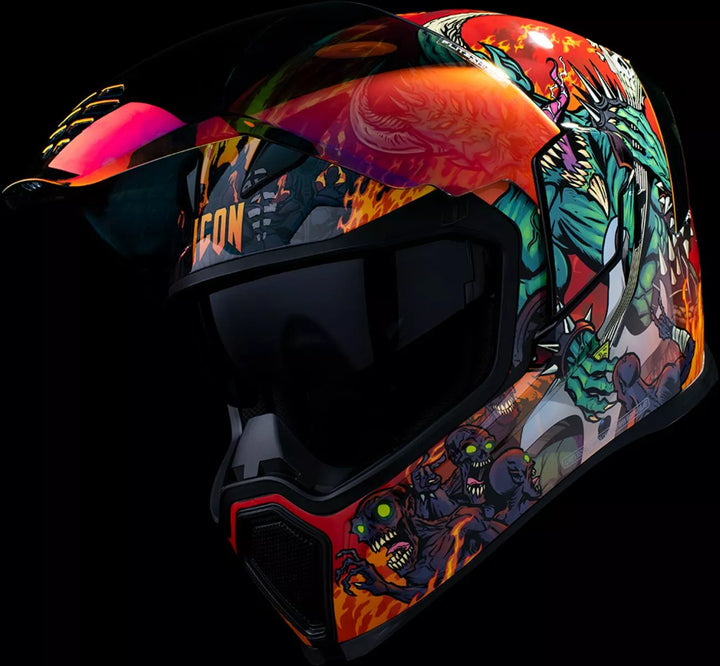Removable Molded Breath Deflector and Chin Curtain, Injection Molded Polycarbonate Shell for Strength, FAG-FREE Dropshield ™ with Exterior Switch, Recessed Twin Channel Supervent Cooling System, Multiple Oversized Intake Ports Side Plates, The Dropshield ™ Visor Must Only Be Used While the Main Face Shield Is In The Fully Closed Position, Removable Hydradry ™ Moisture Wicking Liner, Glow in the Dark, Internal Speaker Pockets Work With Icon's R.A.U. Bluetooth Device, Includes Clear & RST SUNSET FOG-FREE FLITESHIELD