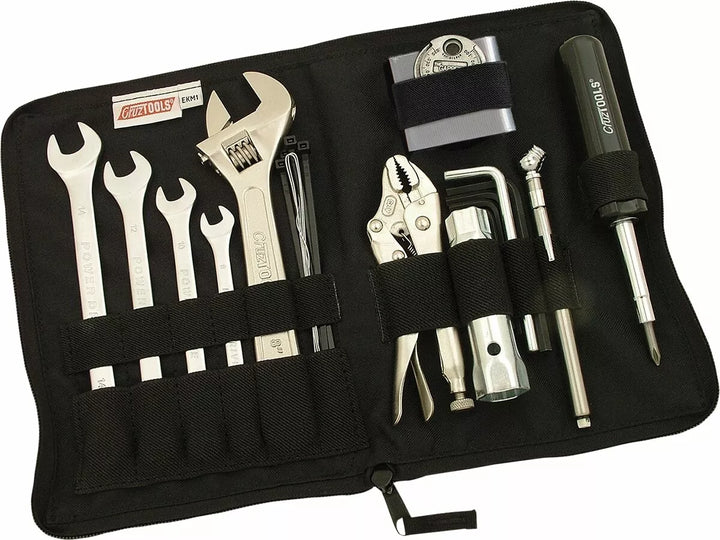Provides Combination wrenches, an adjustable wrench, lureing pliers, 6-in-1 screwdriver, kick plug wrench, tire gauge, duct tape, zip ties, mechanics wire, and a shop towel, all organized in a heavy-duty zipper pouch Kawasaki, Yamaha and Suzuki, Light Weight and Very Compact for Road or Trail-Side Repairs and Adjustments, A High-Quality Upgrade From an Oem Tool Kit For Motorcycle, ATV, and Snow, Lifetime Guarantee-No Quitions-No Questions Asked