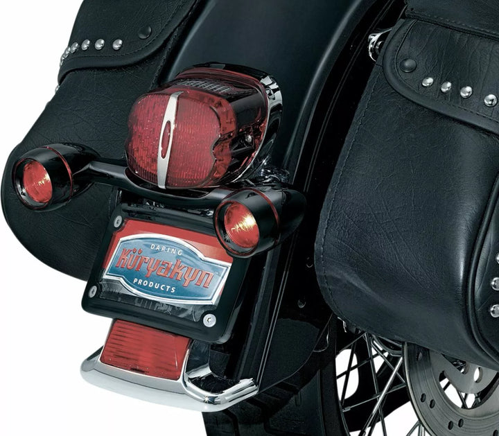 Replace the oem turn signal bar and signals with this streamlined kit, Light Bar Relocates License Plate Below the Taillight; Built-in Light Illuminates The License Plate, Turn Signals Are Single-Circuit, Feature K�ryakyn Deep-Dish Bezels and Red Lenses, Flat License Plate Support Included