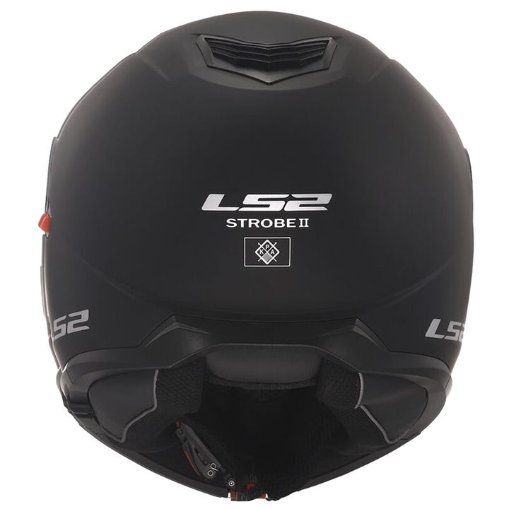 Baksidan av LS2 Öppningsbar Mc-Hjälm Strobe II Svart med logotyp och aerodynamisk design. Idealisk för säker motorcykelkörning.