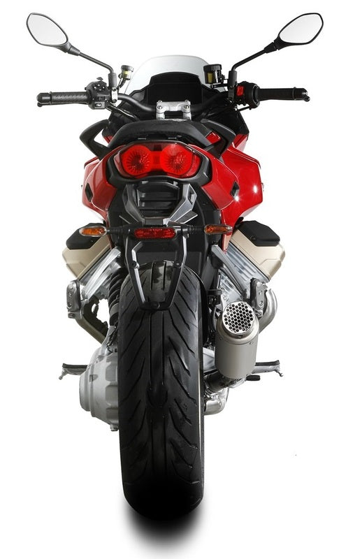 GP Pro, Manufactured by Semi-Handmade Tig Welding, Shows A Compact and Essential Design and An Aggressive Sound. Inspired by the World of Competition, The Exhaust Pipe is equipped with a removable protective grille that hides the db-guy. This Muffler Sports The Characteristic MIVV Logo Created by Laser Technology.