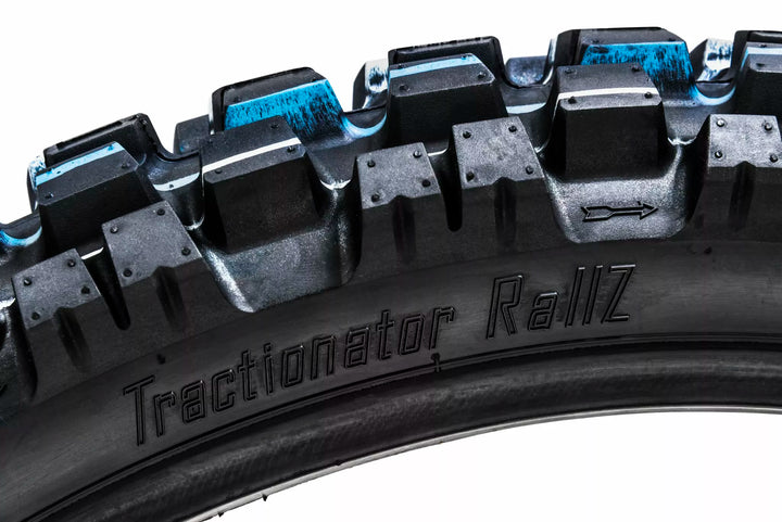 Based on the popular tractionator adventure but with more aggressive off-road traction in all weather extremes., Off-road performance with reasonable on-road manners., Tested and sample construction and compound for adventure and rally use. Without the Need to Change Tyre Pressures Between Off Road and On Road., Self-cleaning and self-sharpening Tread Pattern Gives Excellent Predictability and Power Delivery., Hybrid to coastal Compound with Silica for Optum Grip in Mud and Snow. Forests and Fire Trails., Rallz Also available in Range of Tube Type Adventure Sizes for Light Weight Adventure Bikes.