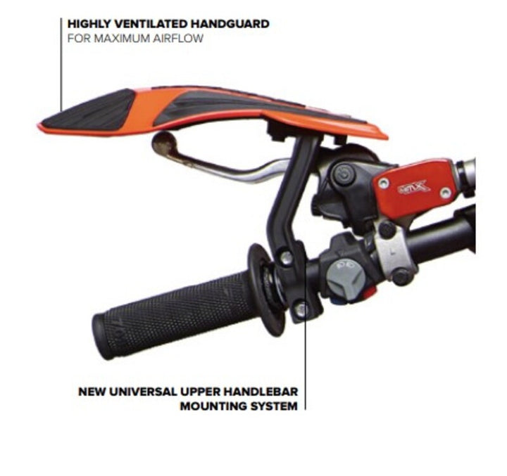 MX Air is a dual material handguard that features a new universal mounting system. This New Mount is assembled Between Grip and Master Cylinder and goes Above the Handlebar, to Make Most of the Space Available and Maximize Protection.