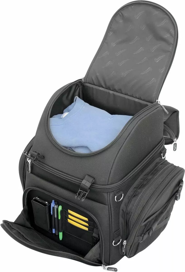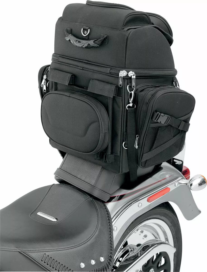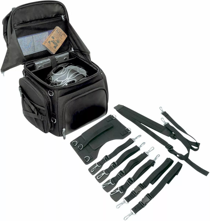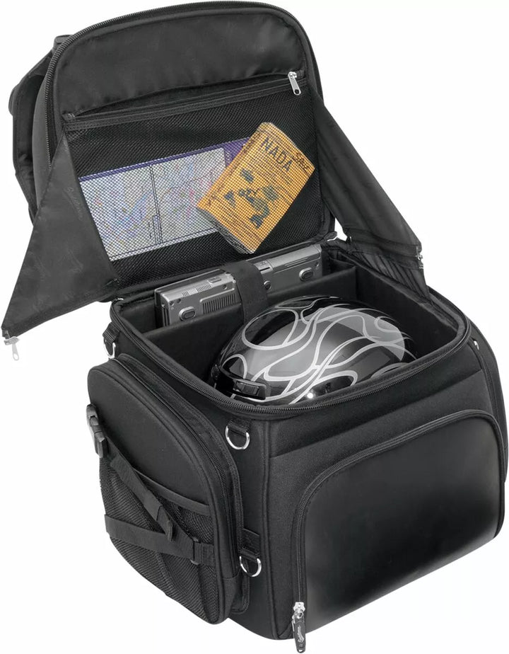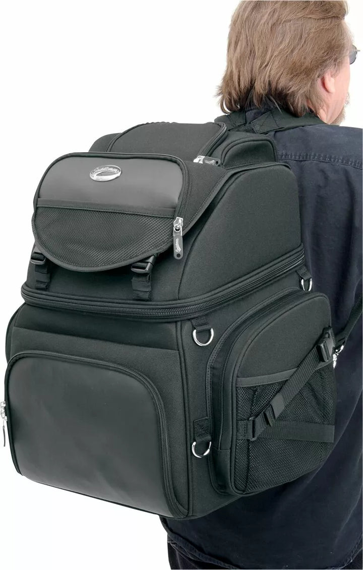 Two Mounting Systems Included: Saddlemen's "Versa-Mount" under-seat Yoke and Harness, and an Adjustable Sissy Bar Strap System that Easily Attaches Bag to Your Motorcycle's Seat, Luggage Rack or Sissy Bar, Backrest Pad Can be Adjusted Detacle Backpack Straps for Easy Off-the-Bike Jaunts, Include Another Large Top-Loading Main Compartment with Internal Organizer Pocket, Five External Pockets, Two of Which Can Be Expanded For Added Capacity, Five Internal and Two Outer Mesh Pockets The Elements, Top Exterior Flap Can Be Adjusted to Carry A Jacket, Mini-Padlock, With Extra Keys, Helps Secure Your Belongings In The Bag, Internal Structure Maints Bag Shape and Is Strong Enough to Lean On, Even When When EMPES 14 " Inches (55.72 l) Cargo Capacity;