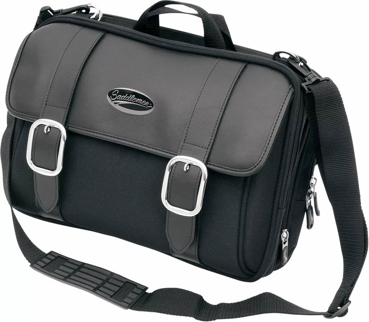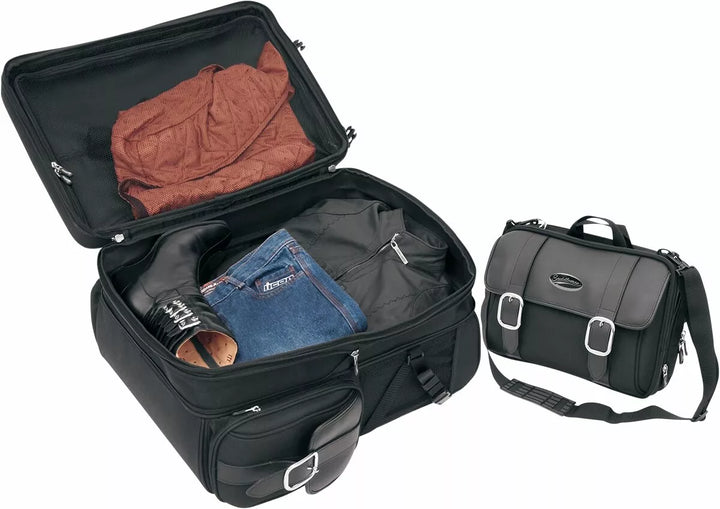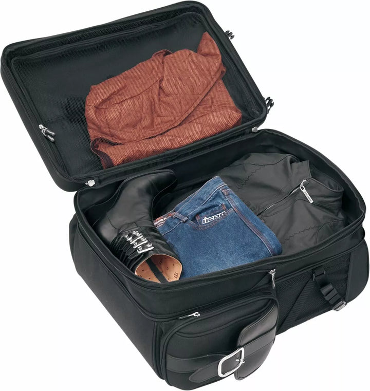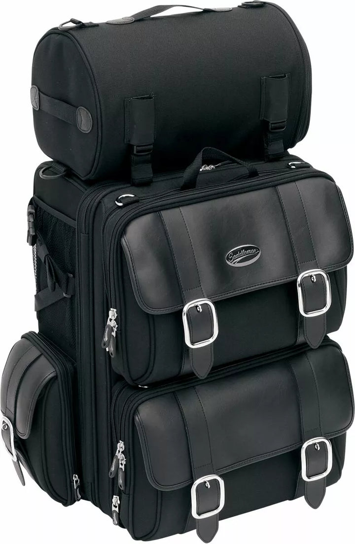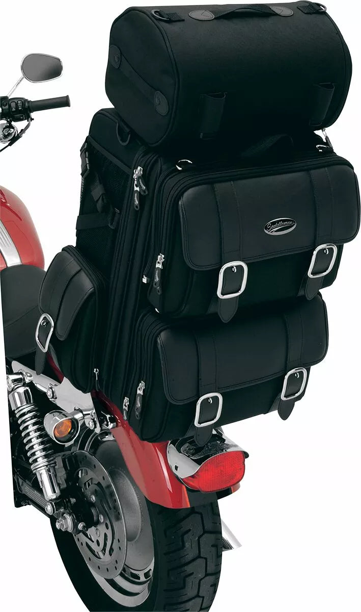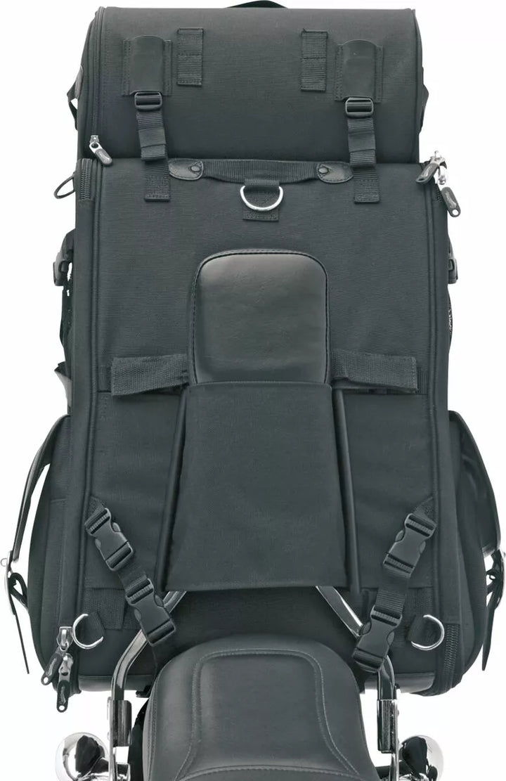 Large Bag Designed to Carry Everything Needed For A Long Trip On The Road; Bag Depth Expands 2-1/2 "To Meet Just About Any Cargo Need, Fully Adjustable Sissy Bar Mounting System Goes On In Seconds Over any Size and Style Sissy Bar Pad; Once Adjusted For Your Size Pad, You Never Need To Adjust It Again R850 Roll bag included for Extra Cargo Capacity; Top Cargo Straps Mount Included Roll Bag or Strap on Jacket, Rain Gear, etc., Top Carry Handle, Backpack Straps and Shoulder Strap for Easy Toting Off Bike, Internal Office Organizer and Lockable Zipper and bike 1200-denier Saddletuff ™ and Leather-like, Maintenance-Free Saddlehyde ™ Panels, Expands to 15 "D
