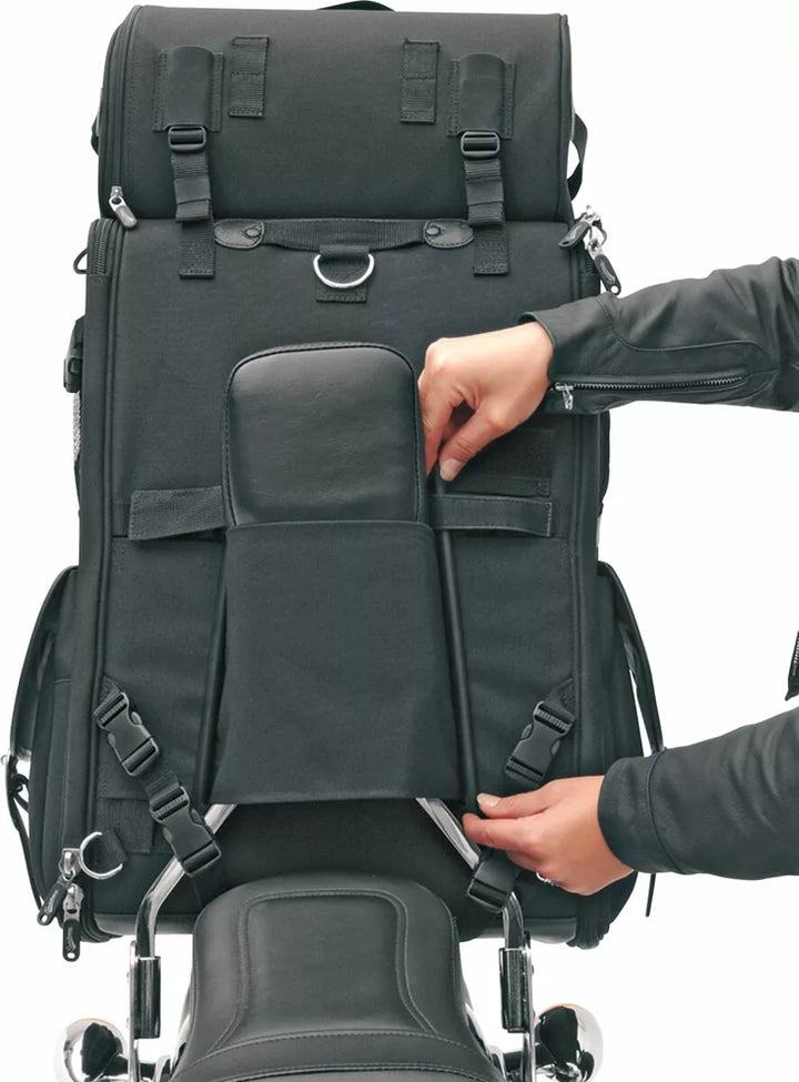 Big, Full Side Openings Allow Easy Access to Bag Contents while bag is still mounted on bike, fully adjustable sissy bar mounting system goes on in seconds over any size and style sissy bar pad; Once Adjusted for Your Size Pad, You Never Need to Adjust It Again, Rigid Construction Holds Bag Shape Even When Empty, R850 Roll Bag Included for Extra Cargo Capacity; Top Cargo Straps Mount Included Roll Bag or Strap On Jacket, Rain Gear, etc., and its Separate Mounting Systems Allows Independent Installation on Rack, Seat or Sissy Bar, Top Carry Handle, Backpack Straps and Shulder Strap for Easy Toting Off Bike, Top Pocket Office Organizer and Locket Office Organizer and Locket Office Organizer and Lockt Office Organizer and Locka Office organizer Raincover, Constructed of UV, Water and Weather resistant 1200-Deniers Saddletuff ™ and Leather-like, Maintenance-Free Saddlehyde ™ Panels, Match Desperado Styling of Other Saddlemen Products, Dimensions: 16 "W DUSUS 40.64 cm Width x 55.88 cm Height x 27.94 cm Depth., EU Capacity 57.36 L