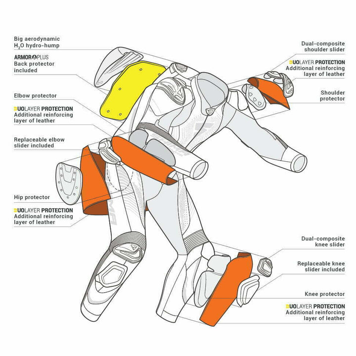 While doing the next turn, your safety will be ensured with a set of certified shoulder, elbow, knee and hip protection along with a dedicated back cover. The suit can also be equipped with SAS-Tec breast protection as an option so that you feel even more safe. The areas that are most exposed to damage are enhanced with an extra layer of leather - Duolayer Protection technology increases resistance to abrasion and cracks.