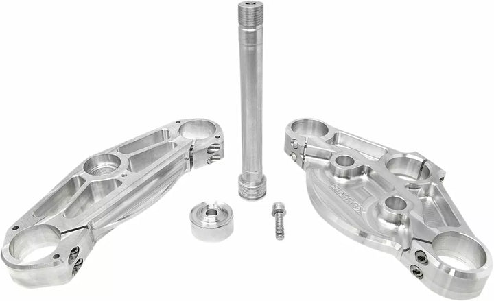 Used When Converting A 41 mm Front Fork Assembly to 49 mm, CNC-Machined 6061-T6 Aluminum Upper and Lower Trees (Stock Rake), Stainless Steel Stem, Accepts Stock Risers and Bushings, Neck Post Bearings, Dust Shields, Adjuster Nut and Requires the Relocation of the Ignition Switch, These Kits Require The Use of Complete '14+ Style 49 mm Fork Assembly, Wheel Assembly, Rotor/Caliper Assemblies and Front Fender (Not included). FLHT/FLHX Models., Not for use with fork boot covers/sliders.