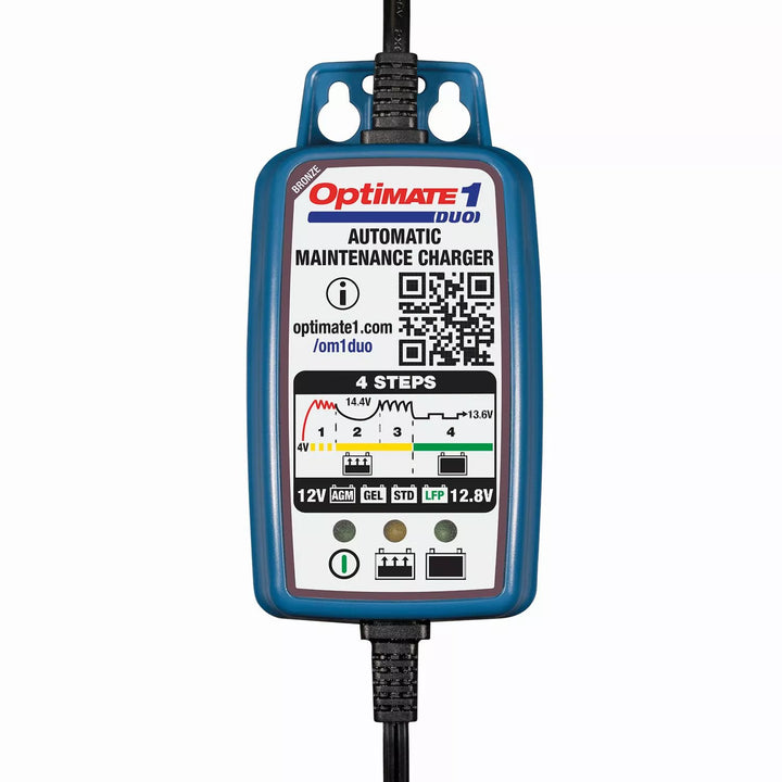 OPTICATE 1 DUO Bronze Series: 4-Step 12V / 12.8V 0.6A Battery Mainainer., The ム No Brainer メ Battery Maintainer for the Hi-Technology Battery In Your Performance Power Sport Vehicle. Guarantees Healthy Lithium or Lead-Acid Battery!, Ideal for 12V Lead-Acid & 12.8V / 13.2V Lithium LFP (LifePo4) Batteries., Duo: Automatically Adapts to the Connected Battery Type. Adapts automatically to pb or lfp battery. OPTICATE 1 DUO DOES THE THINKING FOR YOU!, Charges and Delivers Long Term Maintenance Automatically. OPTICATE 1 DUO MAKES YOUR BATTERY STRONGER AND LAST LONGS, NO SUPERVISION REQUIRED!, Safe to leave connected. Full Electronic Protection., 24/7: Safe to Leave Connected. Full Electronic Protection., Low Volt Start of 4V., Green Technology: Energy Saving Technology. Stand-by power less than 0.5w. Efficient 24-7 Battery Maintenance., IP50: Dustproof. Rated for indoor use down to -20 ᄚ c / -4 ᄚ F., Includes 2 Interchangeable Battery Connection Accessories.