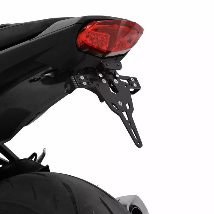 The License Plate Holder is Extremely Durable and Weather Proof., Black Powder Coated. , The License Plate Holder Can Be Used For Any Kind of License Plate (175mm Width)., No Modification of Fairing Required., Stepless Adjustment of Rake Angle., Indicator Support Adjustable in 3 Positions. Plate., Special Indicator Light Mounts (Sold Separately) Required for Stock Indicator Lights., Kit Includes: 1 License Plate Holder Incl. Mounting Kit., LED License Plate Light "e Approved" Incl. Support., Back Light With Support.