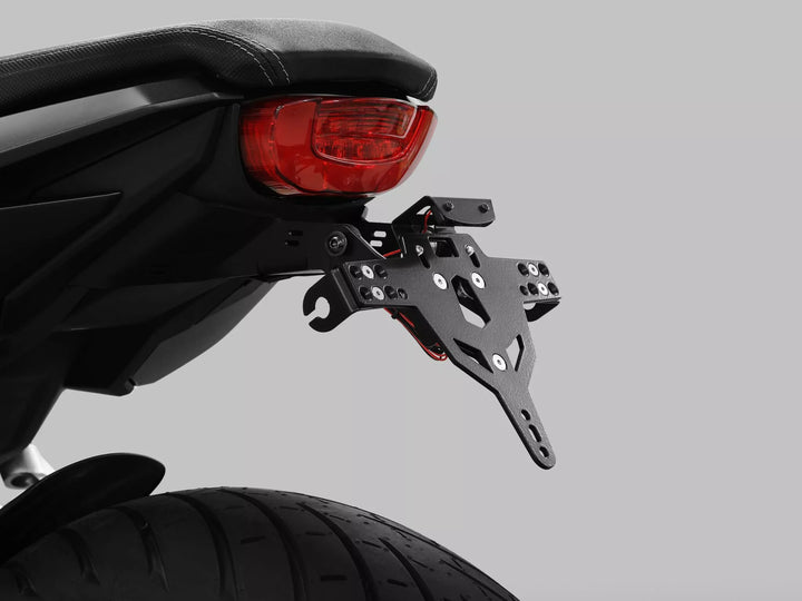 The License Plate Holder is Extremely Durable and Weather Proof., Black Powder Coated. , The License Plate Holder Can Be Used For Any Kind of License Plate (175mm Width)., No Modification of Fairing Required., Stepless Adjustment of Rake Angle., Indicator Support Adjustable in 3 Positions. Plate., Special Indicator Light Mounts (Sold Separately) Required for Stock Indicator Lights., Kit Includes: 1 License Plate Holder Incl. Mounting Kit., LED License Plate Light "E Approsved" Incl. Support., Back Light With Support. Of: Switzerland, Poland and Ireland.