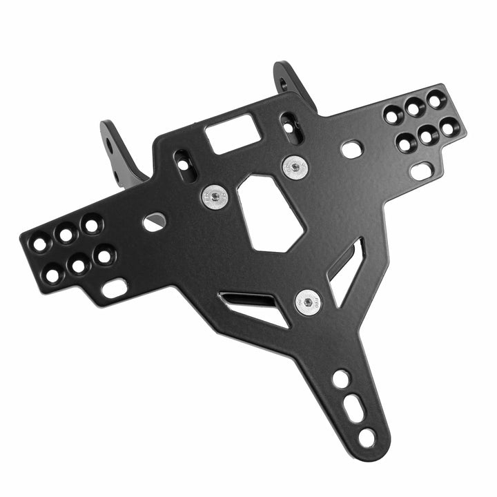 The License Plate Holder is Extremely Durable and Weather Proof., Black Powder Coated. , The License Plate Holder Can Be Used For Any Kind of License Plate (175mm Width)., No Modification of Fairing Required., Stepless Adjustment of Rake Angle., Indicator Support Adjustable in 3 Positions. Plate., Special Indicator Light Mounts (Sold Separately) Required for Stock Indicator Lights., Kit Includes: 1 License Plate Holder Incl. Mounting Kit., LED License Plate Light "e Approved" Incl. Support. Of: Switzerland, Poland and Ireland.
