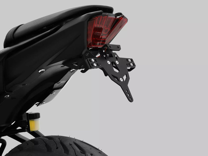 The License Plate Holder is Extremely Durable and Weather Proof., Black Powder Coated. , The License Plate Holder Can Be Used For Any Kind of License Plate (175mm Width)., No Modification of Fairing Required., Stepless Adjustment of Rake Angle., Indicator Support Adjustable in 3 Positions. Plate., Special Indicator Light Mounts (Sold Separately) Required for Stock Indicator Lights., Kit Includes: 1 License Plate Holder Incl. Mounting Kit., LED License Plate Light "E Approsved" Incl. Support., Back Light With Support. Of: Switzerland, Poland and Ireland.