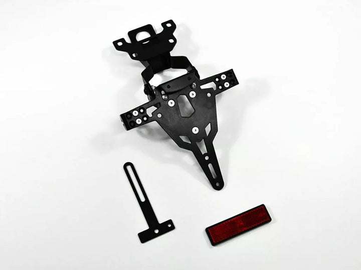 The License Plate Holder is Extremely Durable and Weather Proof., Black Powder Coated. , The License Plate Holder Can Be Used For Any Kind of License Plate (175mm Width)., No Modification of Fairing Required., Stepless Adjustment of Rake Angle., Indicator Support Adjustable in 3 Positions. Plate., Special Indicator Light Mounts (Sold Separately) Required for Stock Indicator Lights., Kit Includes: 1 License Plate Holder Incl. Mounting Kit., LED License Plate Light "E Approsved" Incl. Support., Back Light With Support. Of: Switzerland, Poland and Ireland.