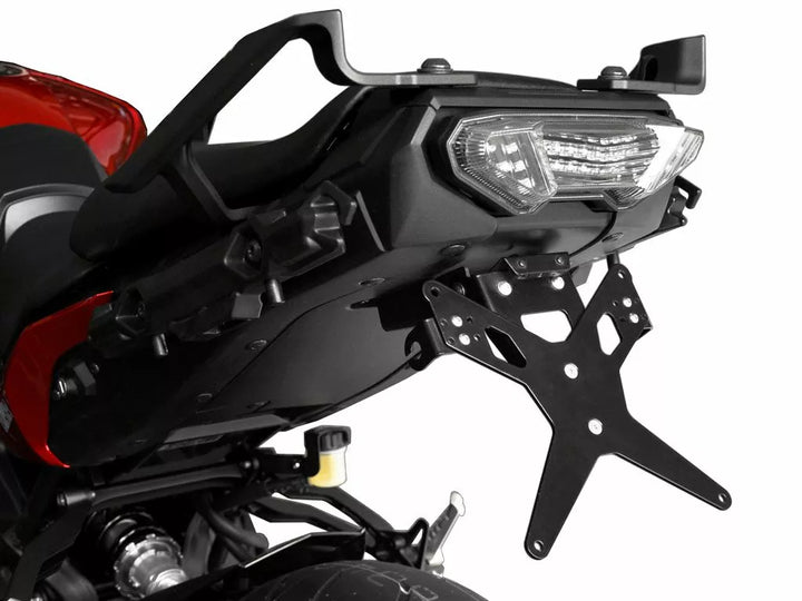 The License Plate Holder is Extremely Durable and Weather Proof., Black Powder Coated. , The License Plate Holder Can Be Used For Any Kind of License Plate (175mm Width)., No Modification of Fairing Required., Stepless Adjustment of Rake Angle., Indicator Support Adjustable in 3 Positions. Plate., Special Indicator Light Mounts (Sold Separately) Required for Stock Indicator Lights., Kit Includes: 1 License Plate Holder Incl. Mounting Kit., LED License Plate Light "e Approved" Incl. Support., Back Light With Support. Disclaimer: Important: For the use of this license Plate Holder with the oem Turn Signals of Ducati Models (2015 - Present) A Special Holder is Needed (Zieger Turn Signal Adapter and Duc. Parts Europe Part Number: 20301971. Vendor Number: 10005790).