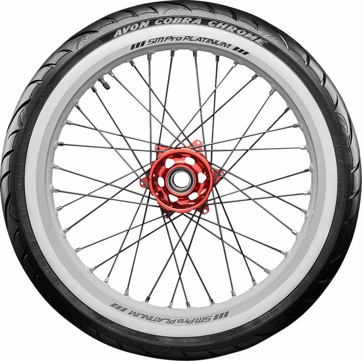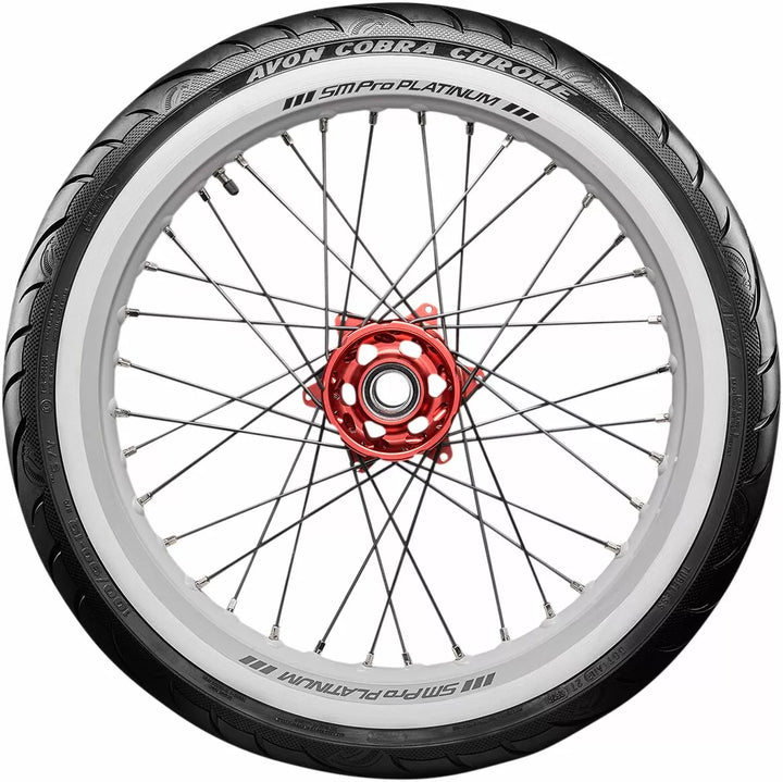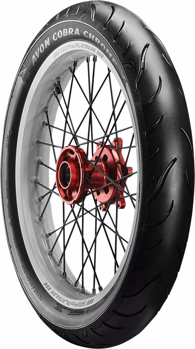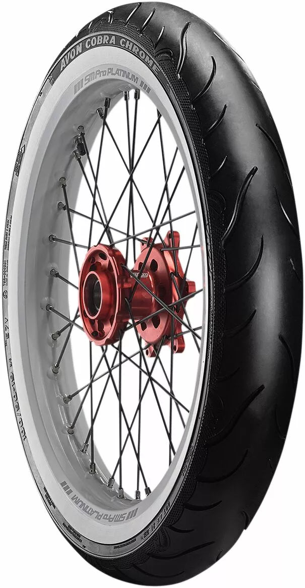 Avon's Latest Tech Pattern and Advanced Construction Produces Over A 5% Larger Footprint Compared To Avon Cobra, High Stability In All Conditions Deliveness Precise Feel and Tire Feedback, Better Traction and Shorter Stopping Distances, Even in the Wet, Incorporates Sports Tirive Longevity ヨ Perfect for Touring, Unique Tire Design with Detaileled Aesthetic Features, Improved Tire Life Over ITS Precessor, Snakeskin-Effect Treat, Aimed at the Power Cruiser/Touring/Market Custom.