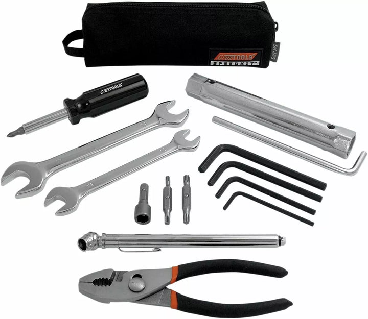 Kit de scule ultra-compact, ambalat cu funcționalitate pentru motociclete metrice, UTV, ATV, motociclete de zăpadă, biciclete de zăpadă și nave de apă personală, dimensiunile sunt de aproximativ 7 "x 2" x 2 ", kit include, 10x12 mm chii de capăt deschis, 14x17 mm Combo bujie cu bujie cu ficat, mini 5-in-1 cu șuruburi cu Torx T20, 25, 27 3, 4, 5, 6 mm, 10-50 PSI GAUGE TIRE, 5,5 "clește de job-job-job, pungă cu fermoar greu, durată de viață