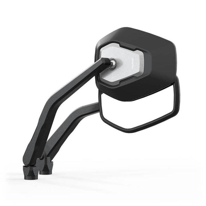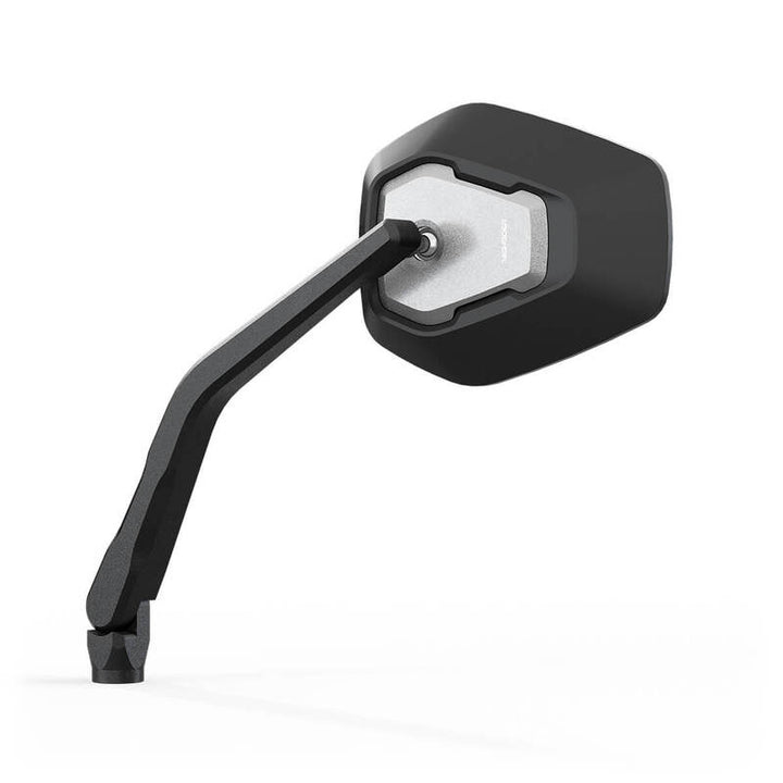 Trapezoide în creștere și plate creează designul futurist al serialului de oglindă Esagano-RS Highsider, care preia astfel limbajul de design al motocicletelor moderne. Corpul de bază al capului oglinzii, din plastic de înaltă calitate, închide incrustarea distinctivă, care este prelucrată CNC din aluminiu. Acest lucru simbolizează limbajul de design al familiei de produse Esagano și creează o valoare unică de recunoaștere cu geometriile crescânde și plane conice. Perla a izbucnit și suprafața anodizată neagră mată a aluminiului contrastează cu suprafața capului oglinzii, completând imaginea. Tulpina, în aluminiu, Alles! În același timp, datorită designului său, oferă suficient spațiu între zona mânerului și tulpina oglinzii.