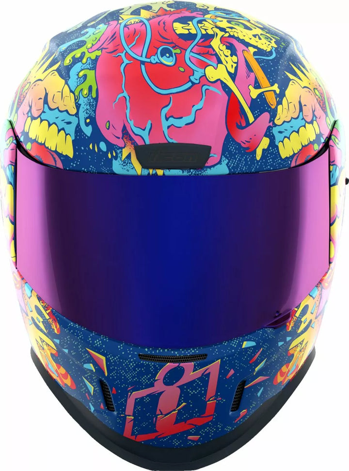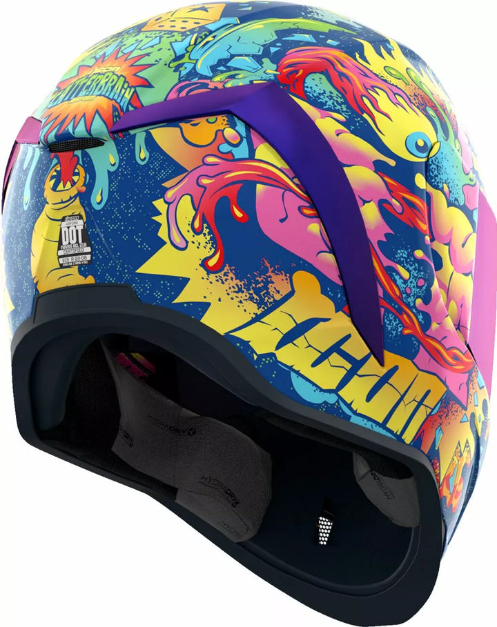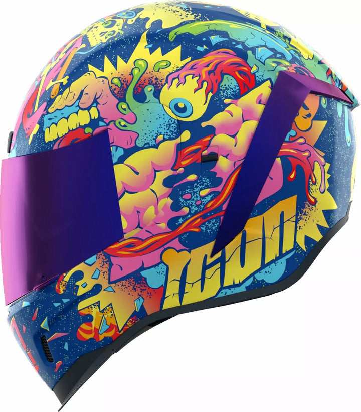 Injection Molded Polycarbonate Shell for Strength, Internal Airflow Geometry, Continuous Venting System, Sculpeed NECK Roll, FAG-FREE ICON OPTICS ™ Shield with Rapid-Reale ™ System, Prolock ™ Positive Shield Locking System, Internal Drop High Visor must only be used while the main face shield is in the fully closed position, removable Molded Breath Deflector, Removable Hydradry ™ 3-Piece Moisture Wicking Liner, Buzunarele de vorbitori interni funcționează cu Icon's R.A.U. Dispozitivul Bluetooth, include Dropshield de fum întunecat, include Clear & Rst Purple Optics Shield ™