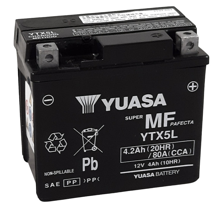 Yuasa YTX5L-FA este unul Baterie AGM performantă, fabrică activată și gata de a fi utilizată direct. Asta este perfect pentru Motociclete, scutere, biciclete quad și alte vehicule mai mici asta necesită Putere de pornire fiabilă, durată de viață lungă și întreținere minimă.
