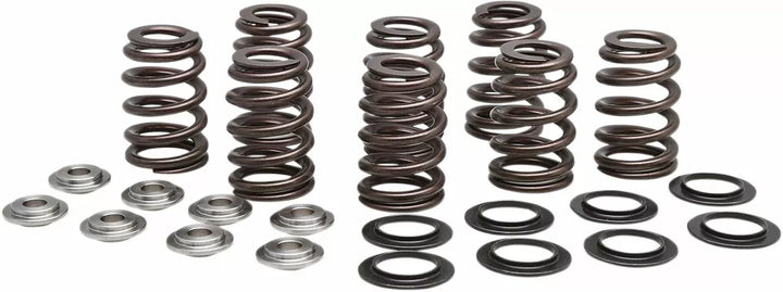 Progressively Wound Springs Using Kobe Super-Clean, Chromium Silicon (CRSI) Based Wire That is Heat Treated and Shot Peended, Tight-Tolerance, FEA-Designed Hardended Steel Posi-Loc ル Style Upper or Titanium retainers to altaine Through ", Heat Treated (H.T.) Steel Basewashers are designed to fit on top of eiter the oem or kpmi tophat seals in this kit, Made in the SUA, Kit folosește tastele de supapă în stil OEM (vândute separat).