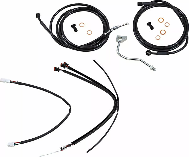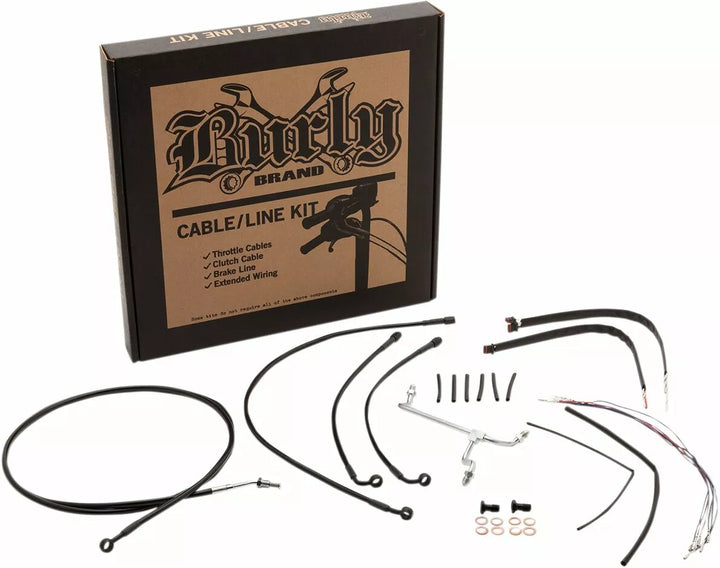 Kit de instalare complet pentru umerașele Burly Ape, kitul include linia de frână extinsă (cu excepția cazului în care se menționează), linia de ambreiaj extinsă/ambreiaj, cabluri de accelerație extinsă/ralanti, după cum este necesar și toate cablurile necesare, linii interioare de frână, Whhen inclus, FELEMUDD, Braid externe, Kits Reuse Reuse Stock Throttle-By-By-By-Wire, Kit se bazează pe 2 "Risers cu haner-by-wire harness.