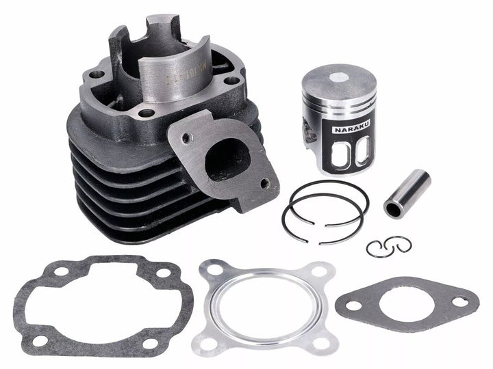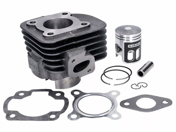 Setul de cilindri din fontă Naraku 50cc este o alternativă accesibilă și robustă pentru OMS solicită o înlocuire din cauza daunelor cilindrului sau a pistonului, puterea de putere este ceva mai mare decât pe butoiul inițial. Valoare foarte bună pentru bani, kit de cilindri de înlocuire simplă, furnizat cu garnitură; Capul original este utilizat în continuare, piesele pentru acest kit pot fi selectate din gama noastră, potrivite pentru motorul de 1E40QMB și un pin de gudgeon de 12 mm, atunci când instalați inelele pistonului, vă rugăm să vă asigurați că marcajul "t" t "j" care indică inelul pistului pistenului pisten, altfel pistonul nu poate fi montat.