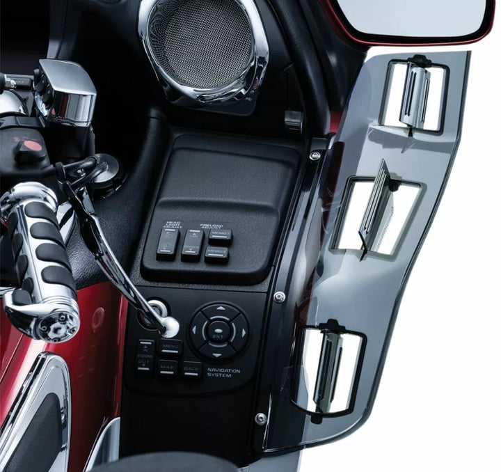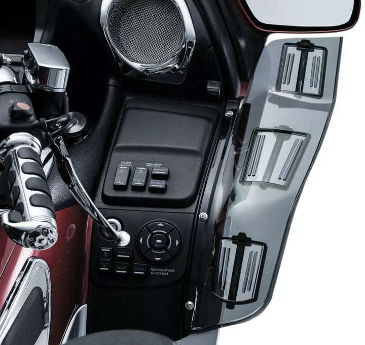 Oferă o protecție deplină a vântului împotriva oglinzilor, până pe părțile laterale ale caroseriei, fluxul de aer poate fi îndreptat către sau departe de călăreț sau pasager, cu trei deflectoare de vânt reglabile pe parte, un mecanism lacat cu arc se menține în loc; Ușor de ajustat manual, construcție de policarbonat cu nuanțe întunecate, nu folosiți ploaia-X sau alte produse de curățare sau protecție pe bază de amoniac pe acest produs.