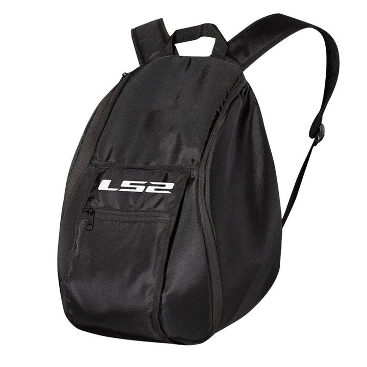 Svart LS2 hjälmväska med dragkedjeförslutning och logotyp, designad för säker förvaring och transport av motorcykelhjälmar.