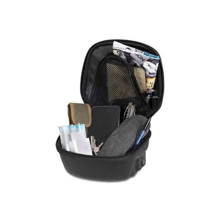 În interiorul capacului există un compartiment cu plasă cu fermoar pentru stocarea articolelor. Compartimentul principal are un panou de plasă pentru a minimiza mișcarea conținutului. Are fermoare potrivite pentru utilizare cu mănuși. Are un mâner de transport, o curea de umăr și elemente reflectorizante pentru a -și crește vizibilitatea la alte vehicule.
