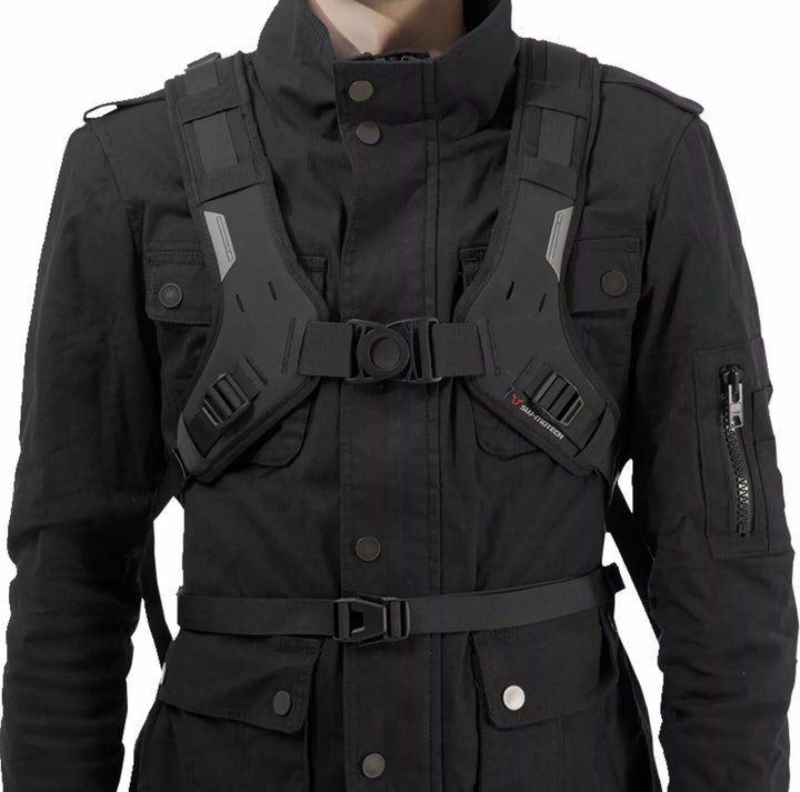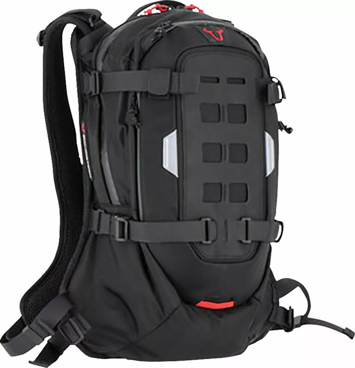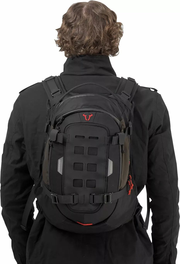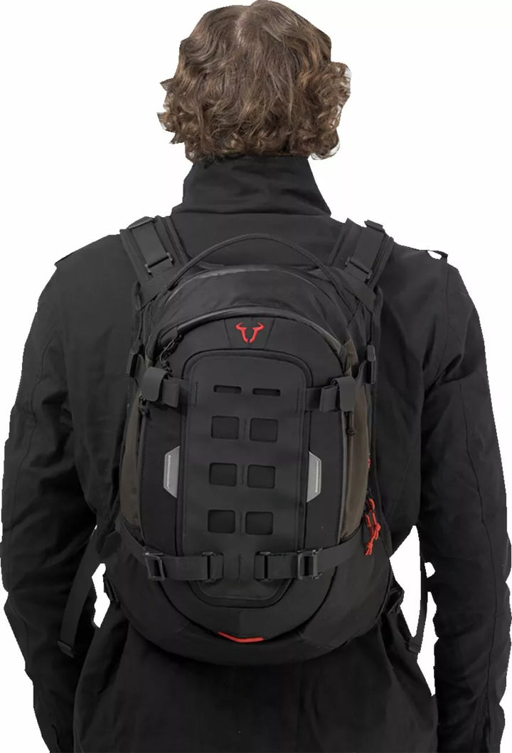 Țesătură de nylon balistic și 210D Ripstop, căptușeală din spate din țesătură de plasă permeabilă cu aer, Sistem Molle din materiale hypalon robustei pe partea de sus pentru atașarea accesoriilor, forma ergonomică-panoul din spate curbat se adaptează la călăreți, volumul reglabil compre compre cu bretele de umăr, închiderea cu centură cu închidere rapidă, cu ușurință, pentru a purta mai mult timp în trafic, cu bretele, cu belie cu închidere rapidă Compartiment cu fermoare laterale, compartiment pentru 15 "(38 de ieșire, capac de ploaie depozitat, mâner de transport